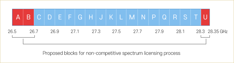이번에 제안된 대역은 26.5-26.7 GHz (A & B 블록) 와 28.3-28.35 GHz (U 블록) 이며, 전체 구성은 26.5 - 28.3GHz (100MHz, 18개 블록) 과 28.3 - 28.35GHz (50MHz, 1개 블록)으로 나뉨