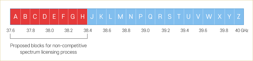 37.6 - 38.4GHz (A ~ H 블록) 대역이 제안되었으며, 전체 구성은 37.6-40 GHz (100 MHz, 24개 블록)으로 나뉨